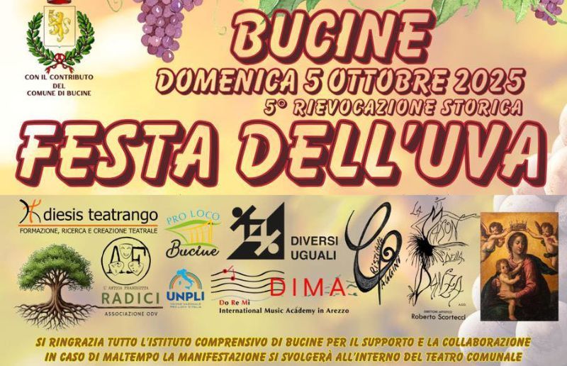 Domenica 5 Ottobre a Bucine, Arezzo, si celebra la III° Festa dell'Uva, stand gastronomici, prodotti tipici, degustazioni, accompagante dalla sfilata storica dei bucinesi in costume con le rappresentazioni artistiche sulla vendemmia.