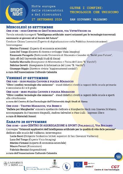 “Siamo molto lieti – dichiarano il sindaco Valentina Vadi, l’assessore alla cultura, università e istruzione superiore Fabio Franchi e l’assessore all’istruzione Laura Ermini – di presentare il programma di Bright a San Giovanni Valdarno anche per l’edizione 2024. Da quando, pochi anni fa, grazie alla presenza nella nostra città del Centro di GeoTecnologie dell’Università di Siena, decidemmo di aderire alla manifestazione, Bright è cresciuta e si è sempre più configurata come una manifestazione di promozione della scienza e della ricerca anche nella nostra città e in tutto il Valdarno. Grazie al Cgt e alla fattiva e continuativa collaborazione instaurata sia con gli istituti comprensivi che con gli istituti di istruzione superiore dell’intero Valdarno, Bright a San Giovanni si è consolidata e rafforzata acquisendo caratteristiche sue proprie, che la connotano in modo ben preciso a fianco delle iniziative che in questo contesto vengono organizzate nelle principali sedi universitarie. Non solo l’iniziativa vuole richiamare l’attenzione sulla ricerca, sui ricercatori, sulla scienza e gli scienziati, ma vuole anche essere la manifestazione plastica, evidente, della ricca filiera dell’istruzione e formazione presente nel nostro territorio, che vanta il maggior numero di istituti di istruzione superiore della provincia, e la più numerosa popolazione studentesca. La scuola è il primo passo in questo viaggio di conoscenza. È qui che nasce la curiosità, si sviluppano le competenze e si costruisce il futuro. Dobbiamo incoraggiare i nostri giovani a sognare in grande, a non avere paura di esplorare territori sconosciuti. Ma Bright a San Giovanni non è soltanto un progetto dell’università e delle scuole: la cifra della nostra manifestazione è quella di essere aperta e visibile a tutti, di far apprezzare a tutta la cittadinanza il percorso di formazione, istruzione e ricerca che si sviluppa nel territorio. Anche per questo motivo abbiamo deciso di concentrare tutti gli stand, i laboratori e ne dimostrazioni nel centro storico, che è il cuore della nostra città: per dimostrare, figurativamente e fisicamente, come l’istruzione e la formazione siano al centro, siano il cuore del nostro Valdarno e del nostro futuro. La ricerca ci insegna che le risposte più importanti possono arrivare da collaborazioni inaspettate e dialoghi aperti, oltre i confini geografici, culturali e disciplinari. Ogni scoperta è un viaggio che arricchisce non solo chi la compie, ma l'intera umanità. Insieme, possiamo costruire un mondo in cui la conoscenza è condivisa, la scienza è accessibile e ogni mente curiosa trova il suo posto in questo grande viaggio. E, come ormai da tradizione, abbiamo voluto concludere la giornata del venerdì con uno spettacolo pubblico, a ingresso gratuito, e aperto a tutti: ‘Ballata per Margherita’ è l’omaggio che la cantante Ginevra Di Marco ha dedicato a Margherita Hack, una delle scienziate più importanti che il nostro Paese abbia mai visto, scomparsa undici anni fa, che ha saputo mirabilmente coniugare la ricerca scientifica con la sua divulgazione, l’impegno accademico e l’impegno civile, che l’hanno vista in prima fila in moltissime battaglie di progresso e civiltà. Un’occasione per concludere la giornata di venerdì con le parole e il pensiero di questa grandissima scienziata, la sua attitudine alla vita profonda e allo stesso tempo gioiosa, dissacrante coraggiosa e divertente, con l’accompagnamento delle musiche e dell’ incantevole voce di Ginevra Di Marco.. Un sincero ringraziamento al Cgt e ai suoi professionisti, alle scuole del territorio e ai loro dirigenti scolastici e docenti, all’associazione Calamita, alla Materiali Sonori e a tutti coloro che, a vario titolo, hanno consentito l’organizzazione di questa tre giorni. Ma – soprattutto – un ringraziamento alle ricercatrici e ai ricercatori, alle studentesse e agli studenti, per il loro lavoro e la loro partecipazione attiva”.