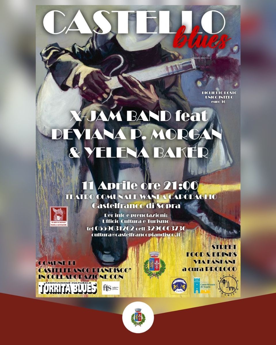 In collaborazione con Torrita Blues a Castelfranco di Sopra, Arezzo Sabato 11 aprile Castello Blues II° Edizione, presso il Teatro Comunale Wanda Capodaglio; evento che si estenderà per le vie del borgo con un conviviale cibo in strada; nn appuntamento tra musica, gusto e convivialità, che cresce, con l’obiettivo di diventare un festival diffuso sul territorio