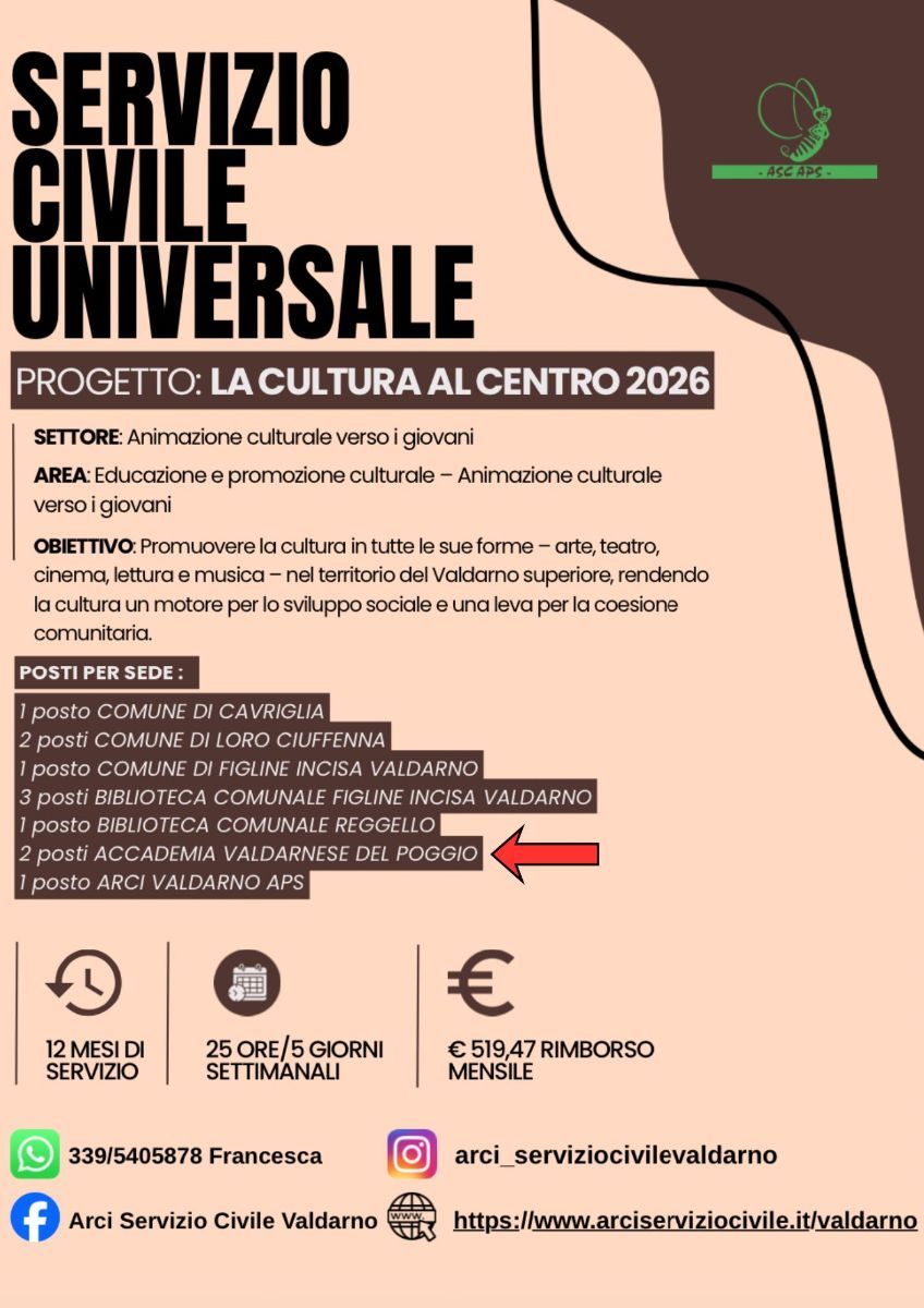 appartiene e che viene messo al servizio della collettività. È possibile candidarsi, solo ed esclusivamente online tramite CIE o SPID, entro le ore 14:00 di mercoledì 8 aprile 2026 andando sul sito www.arciserviziocivile.it e cercando il progetto “La Cultura al Centro 2026”. Per necessità è possibile contattare Arci Servizio Civile Valdarno sempre tramite il loro sito internet.