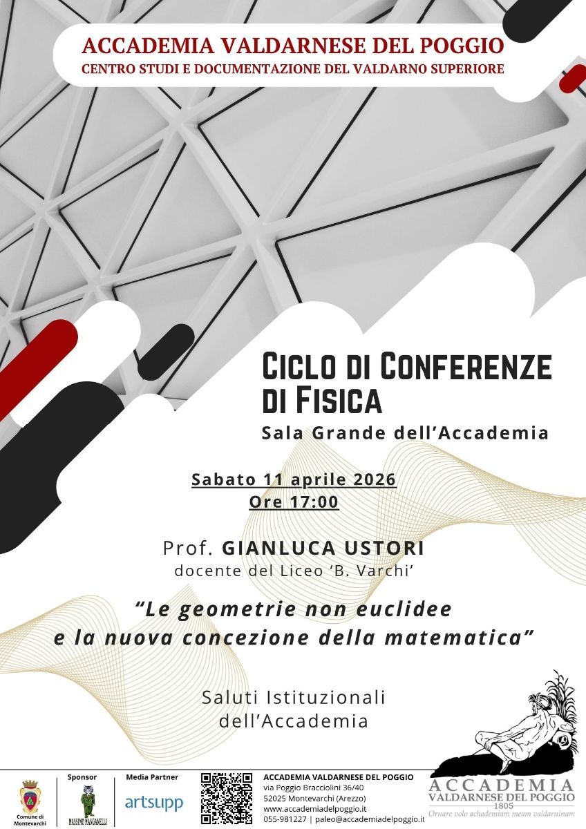 Ripartono le Conferenze di Fisica all’Accademia Valdarnese del Poggio di Montevarchi con il primo appuntamento che si terrà sabato 11 aprile, alle ore 17:00, nella Sala Grande. Il Prof. Gianluca Ustori (docente del Liceo ‘B. Varchi’ di Montevarchi) terrà la conferenza “Le geometrie non euclidee e la nuova concezione della matematica”.