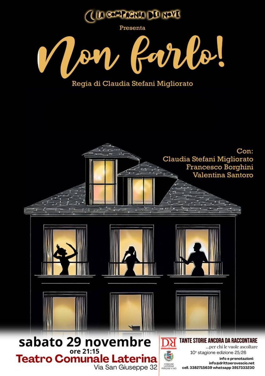 Sabato 29 novembre 2025 nuovo appuntamento con la stagione di prosa del Teatro Comunale di Laterina (AR), alle ore 21.15, la Compagnia dei Nove in scena con lo spettacolo "Non Farlo!", testo di Marco Guglielminetti, regia Claudia Stefani Migliorato.