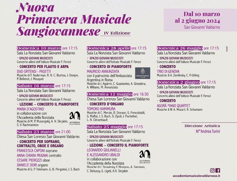 Continuano gli appuntamenti della Nuova Primavera Musicale Valdarnese organizzati dall’Accademia Musicale Valdarnese, con il patrocinio del Comune di San Giovanni Valdarno, dopo il concerto inaugurale domenica 10 marzo alla Sala La Nonziata; un totale di otto appuntamenti di alto livello per la quarta edizione del Festival, che ha l'intento della promozione dei musicisti del territorio, attraverso anche la presentazione di artisti di consolidata fama nazionale e internazionale.