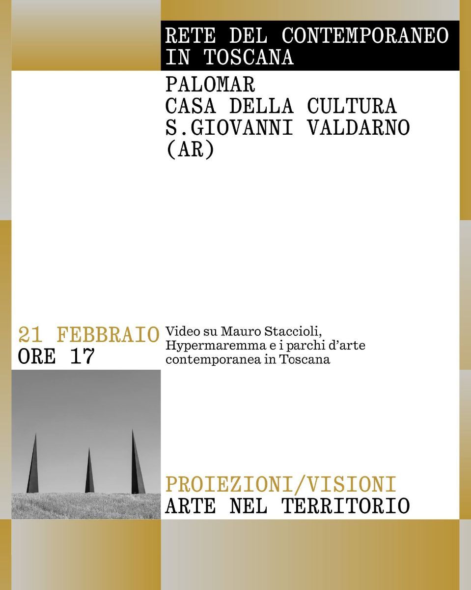 Sabato 21 febbraio presso  Palomar Casa della Cultura di San Giovanni Valdarno, Arezzo,  appuntamento dedicato al rapporto tra arte contemporanea e territorio, attraverso il linguaggio del cinema e del racconto documentario; evento all'interno del  programma della Rete del Contemporaneo in Toscana, di cui Casa Masaccio - Centro per l'Arte Contemporanea SGV è partner.